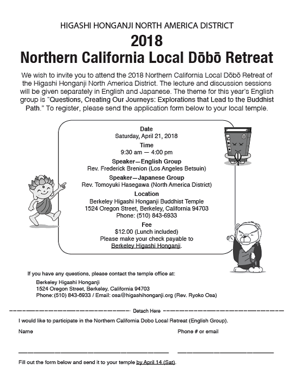 Berkeley Adult School (California) will offer an “Introduction to Buddhism” class taught by Rev. Ken Yamada, the first of its kind and the only religion/philosophy class in the catalog. Rev. Yamada is the former minister of Berkeley Higashi Honganji and current staff of Shinshu Center of America. The class starts 2/7/19, Thursdays, 2 p.m. to 4 p.m. for 6 weeks. Registration fee TBD. To register, click on the link: http://bas.berkeleyschools.net/